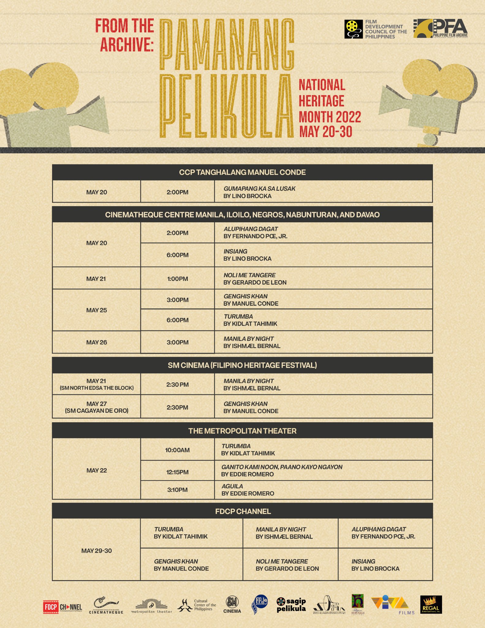 MANILA, PHILIPPINES, MAY 26, 2022 — In line with the celebration of the National Heritage Month, the Philippine Film Archive (PFA) of the Film Development Council of the Philippines (FDCP) is holding free film screenings of classic Filipino films online and onsite in SM Cinema movie theaters, the Metropolitan Theater, and FDCP Cinematheque centres from May 20 to 30.